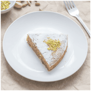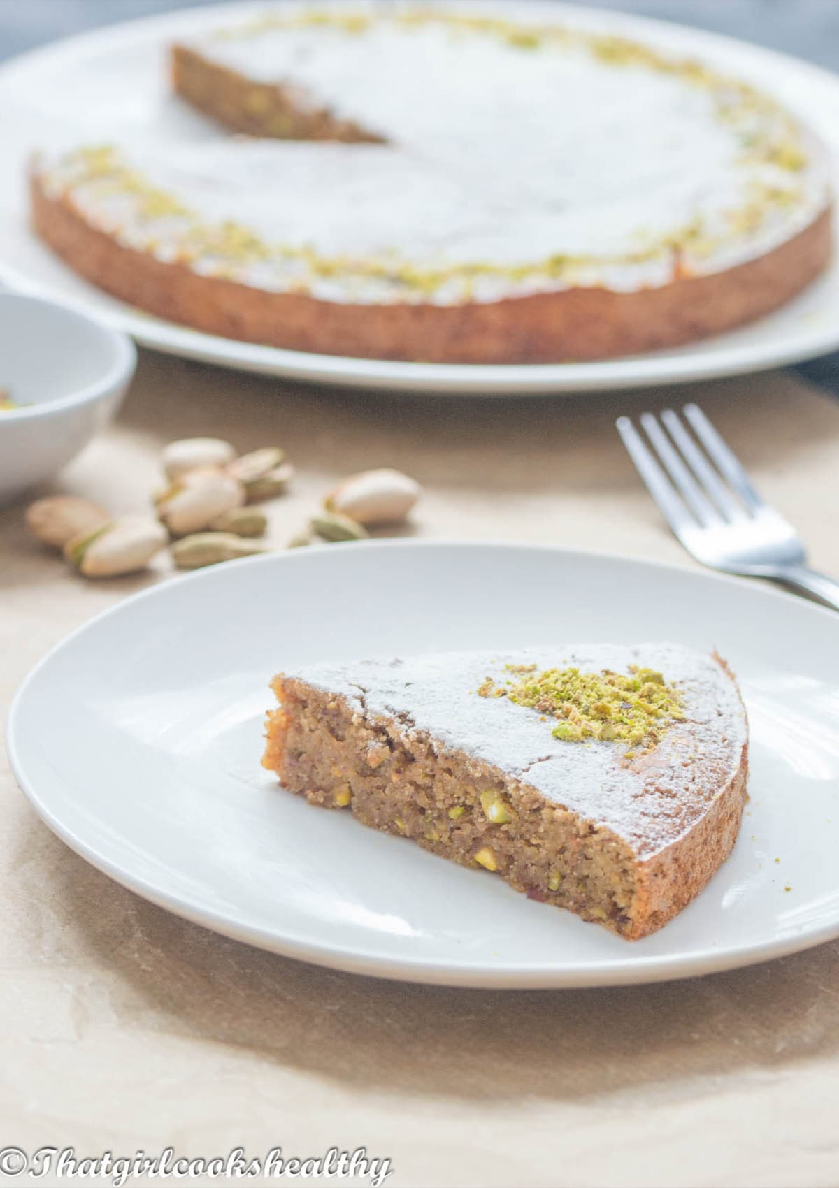 Learn how to make this delicious, moist cake made with almond flour with pistachio pieces. This cake is gluten free, vegan friendly, nutty and perfectly spiced with cardamom flavour.